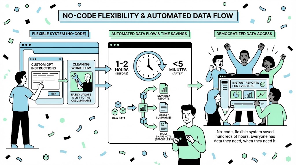 The time savings added up fast. Monthly reports that used to take one to two hours dropped to under five minutes. Weekly summaries became almost trivial. And daily snapshots — something we never had time to produce before — became effortless. Over a full year, the system probably saved me more hours than I care to admit. But the bigger value was that everyone finally had the data they needed, when they needed it, without waiting for someone to “pull the report real quick.”