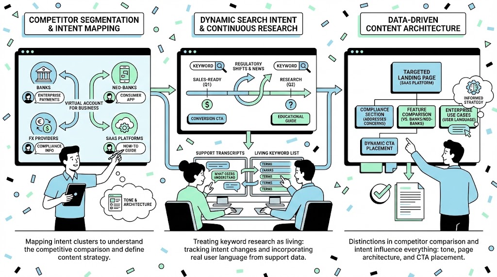 I also found that competitor segmentation plays a much bigger role than in other industries. A keyword like “virtual account for business” behaves differently depending on whether your competitors are banks, neo-banks, FX providers, or merchant-focused SaaS platforms. If you don’t know which category you’re being compared against, you end up writing content for the wrong audience. So I spend time mapping the “competitive intent clusters,” meaning: for each keyword, what does Google think the searcher wants? Compliance information? A consumer app? Enterprise payments? A how-to guide? These distinctions influence everything—from tone to page architecture to CTA placement.