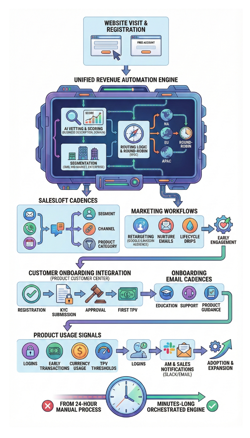 I redesigned the infrastructure that the revenue organization runs on. And because the each automated workflow is modular, rule-based, and API-aware, it can continue to evolve with the business. new products, new regions, new cadences, new routing logic, new onboarding steps. It’s scalable, predictable, and deeply integrated with how the company grows.