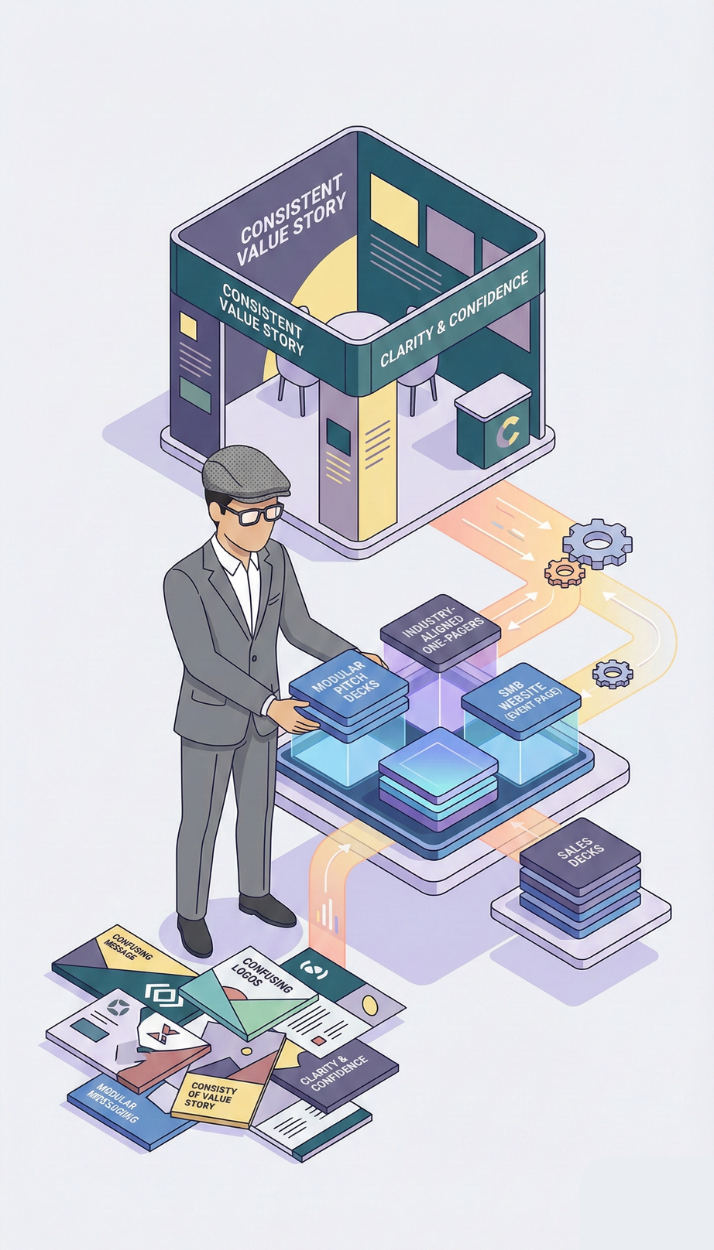I found out the team goes to different type of events use different decks, one-pagers, banners, and talking points. For SMB audiences, especially e-commerce sellers and import/export businesses they focus on, this inconsistency weakened trust. So we redesigned the messaging system so every asset including SMB website (plus event specific landing page), booth, printed materials, and sales decks which reflected the same value story. We introduced modular pitch decks (sales team can pile them together for specific type of targets), industry-aligned one-pagers, and a consistent visual identity across events.