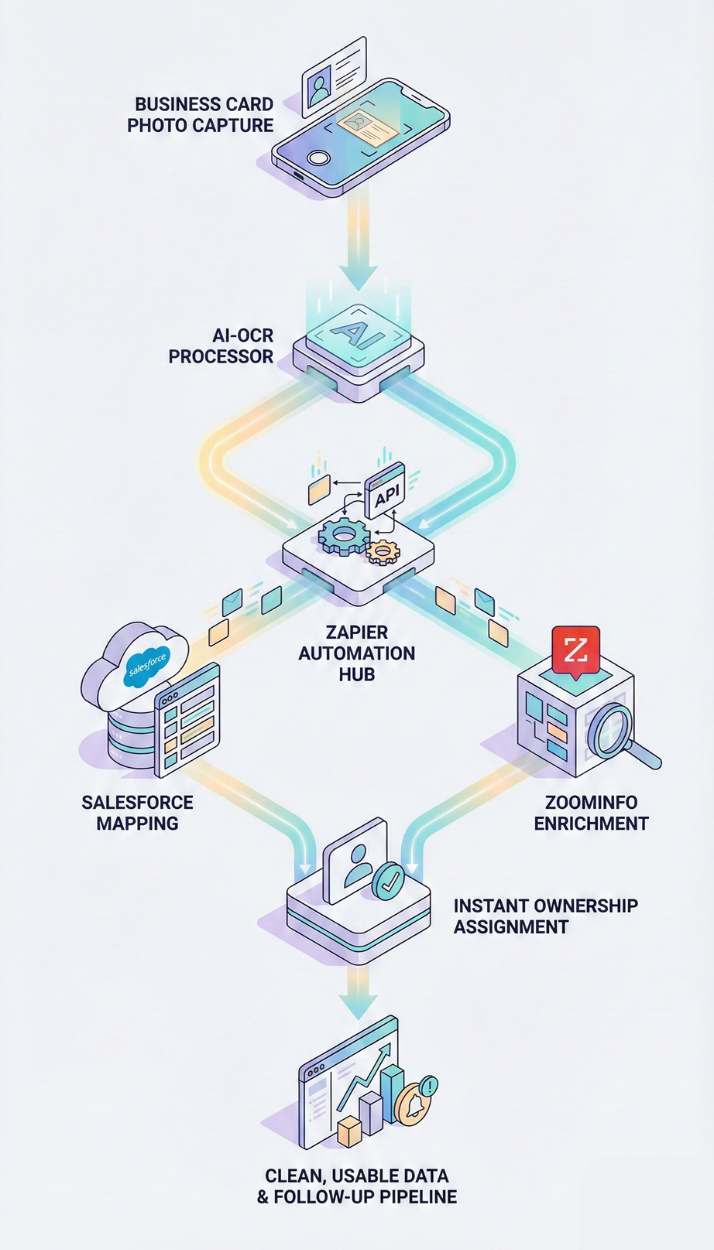 By the time information reached Salesforce, momentum was already lost. I replaced this workflow with an automation-driven lead ingestion system. Using AI-OCR and Zapier, sales reps captured leads simply by taking a photo of a business card. The system extracted the data, mapped fields into Salesforce, enriched the account through ZoomInfo, and assigned ownership within minutes.