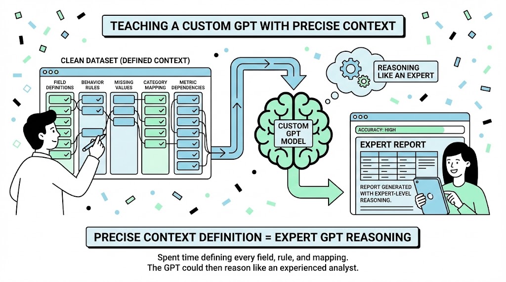 With a clean dataset in hand, the next challenge was teaching a custom GPT how to interpret it. A model can only be as reliable as the context you give it, so I spent a good chunk of time defining every field: what it meant, how it should behave, what counted as a missing value, how certain categories mapped together, and how one metric depended on another. It wasn’t complicated work — just very precise. The payoff was that the GPT could reason like someone who had been doing these reports for years.