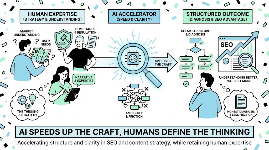 And through all of this, AI never replaces the parts that matter most: understanding the market, interpreting user needs, maintaining compliance in regulated industries, and shaping a narrative that signals expertise. AI accelerates the work, but it does not define the thinking. The strategy still needs to come from someone who understands the business, the audience, and the operational constraints.