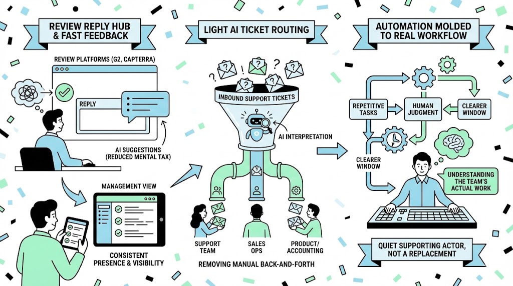 The point wasn’t to automate judgment; it was to remove the mental tax of staring at a blank reply box ten times a day. And almost immediately, the feedback loop improved. The rep responded faster, management could see what was happening without asking for updates, and our online presence became more consistent—not because anyone suddenly had more time, but because the repetitive part of the job shrank.